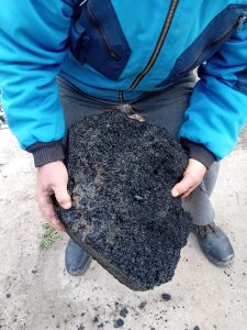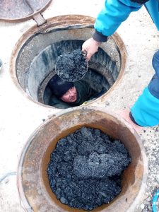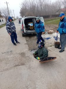 Echipele noastre au scos din canalizare o cantitate uriașă de asfalt rezultat în urma lucrărilor de reabilitarea a drumului, care s-a pietrificat. A fost o intervenție extrem de dificilă, fiind nevoie de echipament special, cu percutor, pentru a sparge bucățile de asfalt și pentru a le extrage.